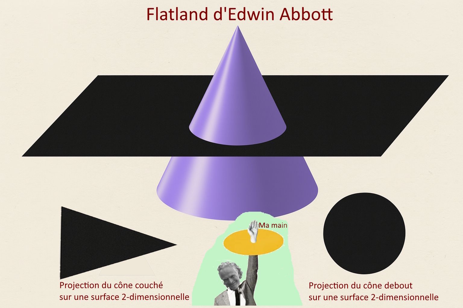 Il m’arrive, dans l’exercice du magnétisme, de sentir que mon esprit ne pense pas seul. Il s’accorde à une structure invisible, comme si chaque parole échangée ouvrait une brèche dans la surface du monde. Cette expérience me rappelle sans cesse une image tirée de Flatland d’Edward Abbott, celle d’un cône traversant un plan bidimensionnel. Pour les habitants de ce monde à deux dimensions, le cône ne se révèle que fragmenté — point, cercle, triangle, forme irrégulière — avant de disparaître. Seul un regard situé dans une dimension supérieure pourrait embrasser, d’un seul souffle, la totalité du cône et de sa trajectoire.